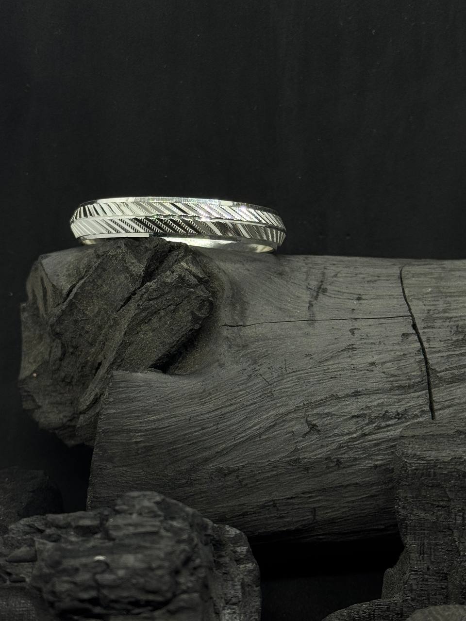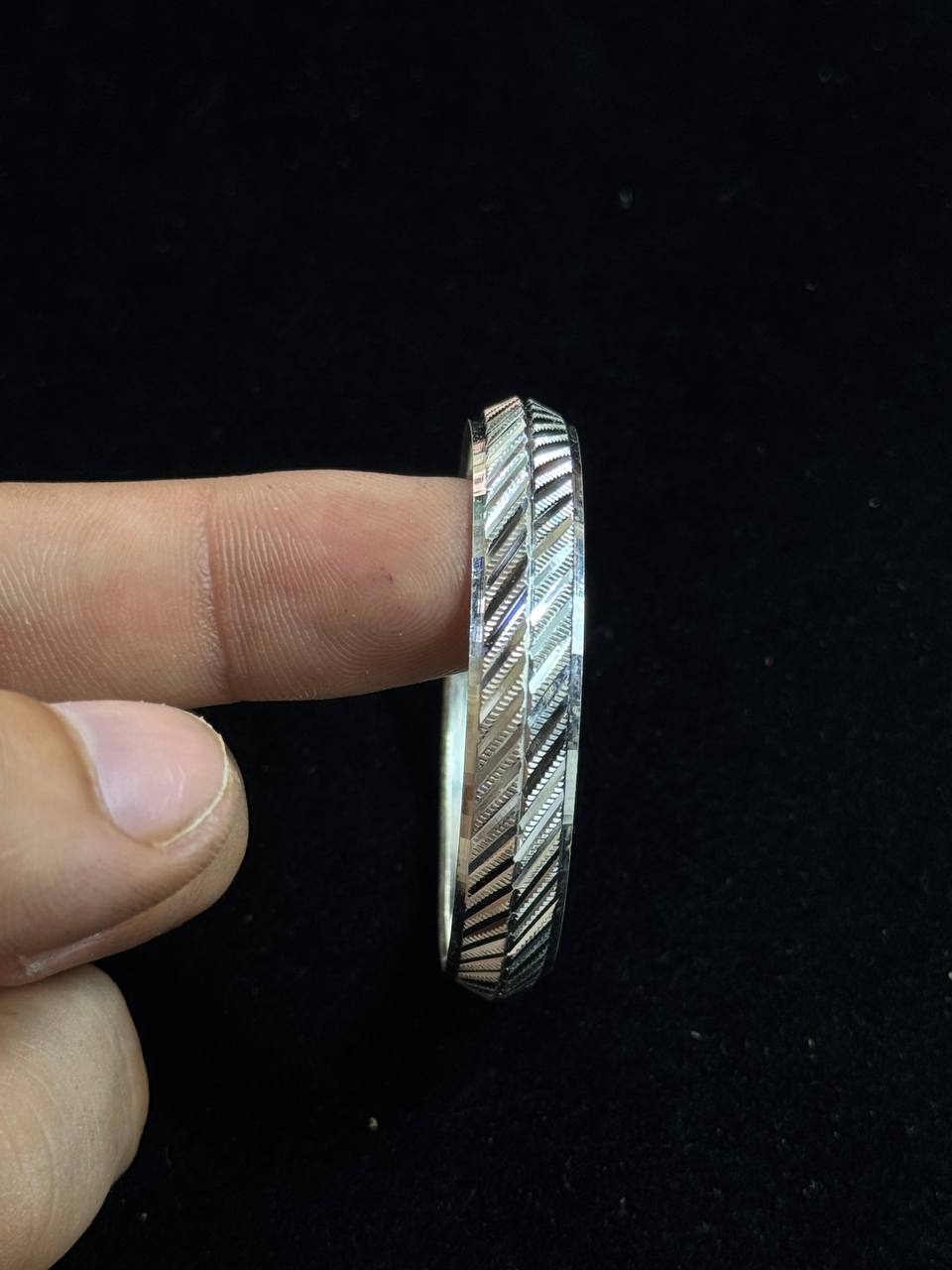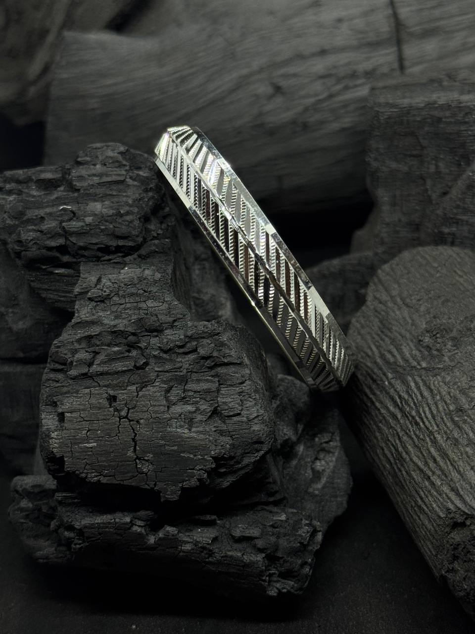 Crafted in pure 92.5 sterling silver, this baby kada features a striking diagonal carved pattern that gives it a bold, modern look while maintaining a traditional essence. The detailed etching reflects light beautifully, adding a subtle shine that makes it stand out.