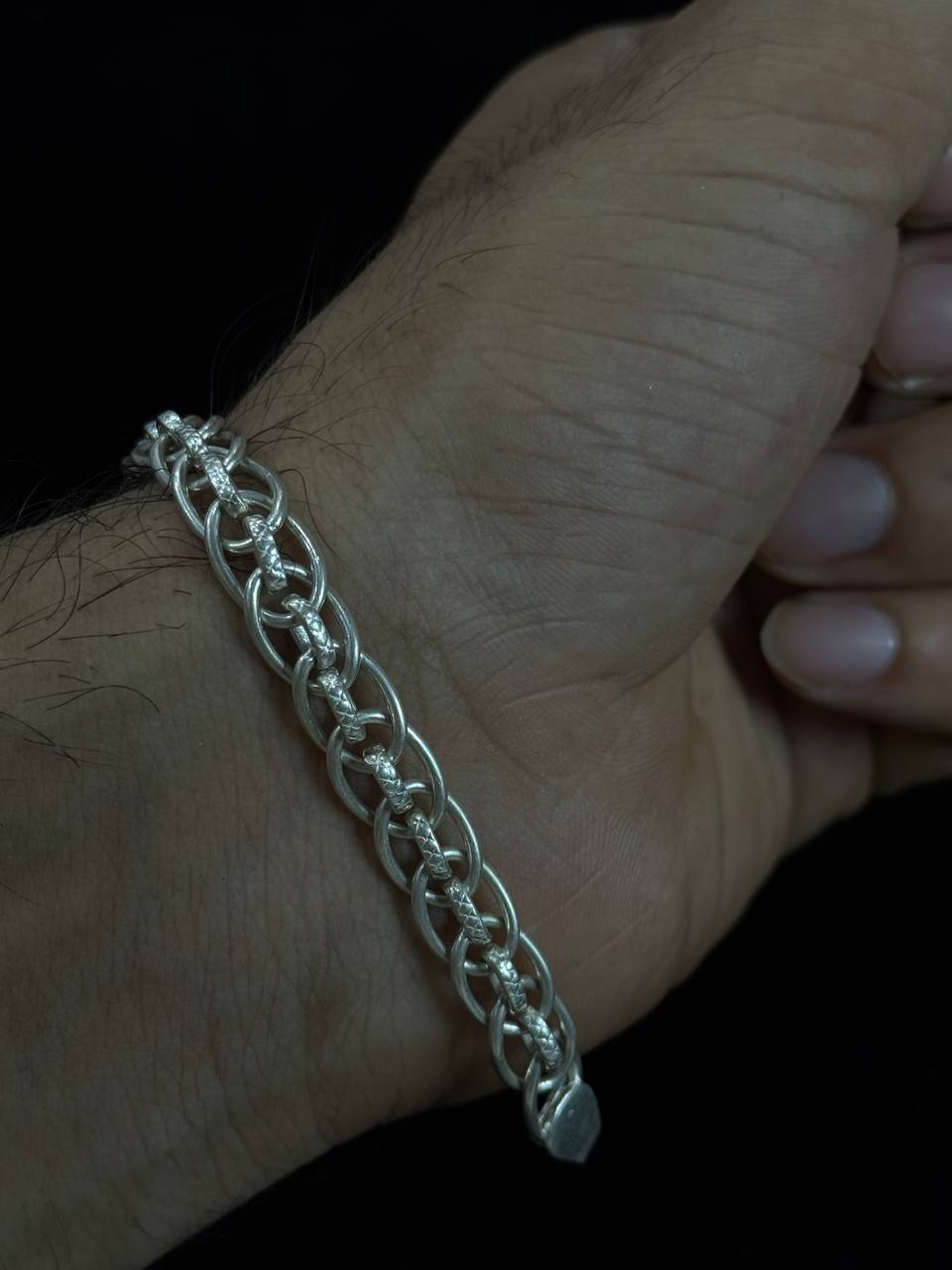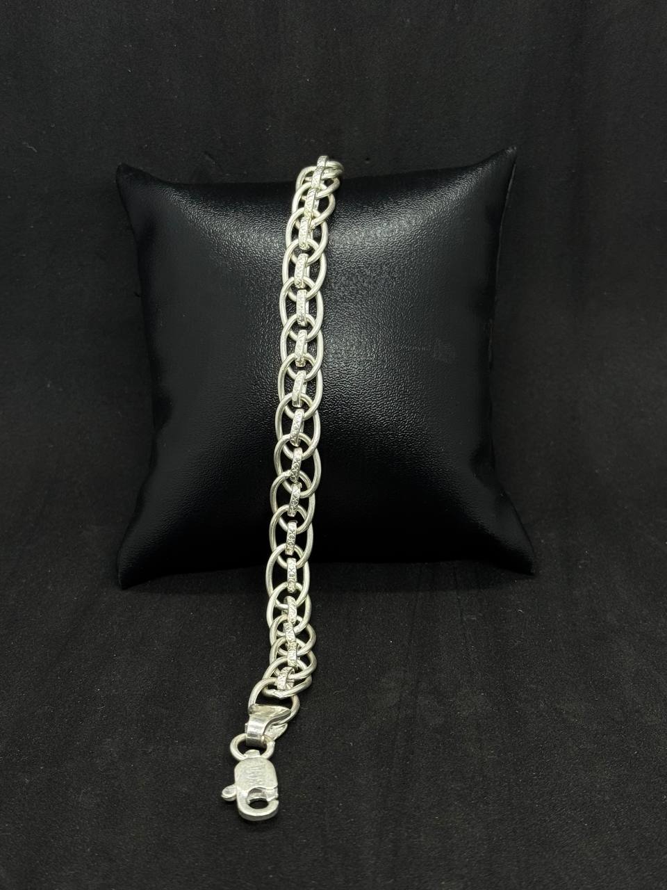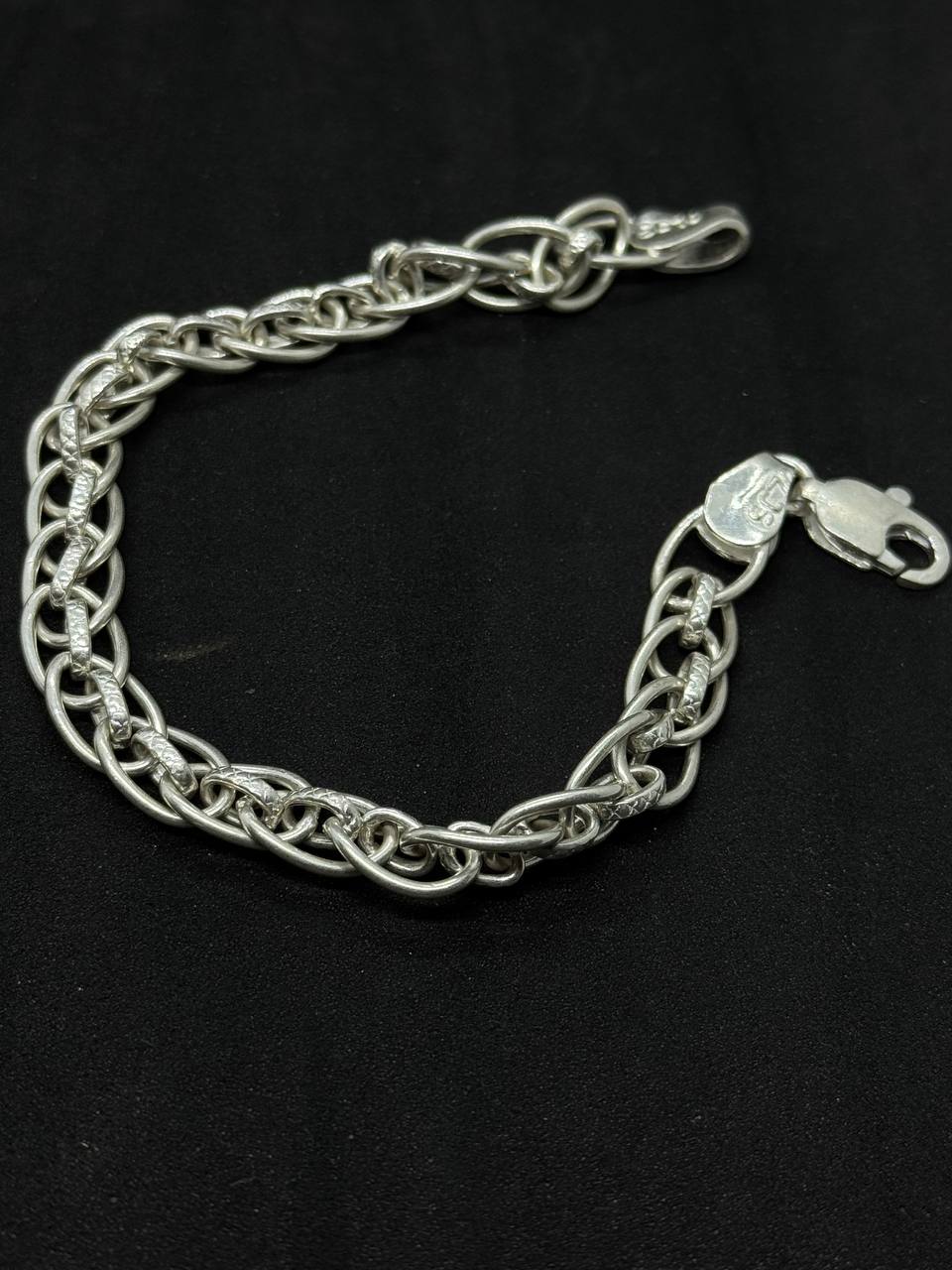 This Dual-Layered Oval Link Silver Bracelet showcases a unique combination of elegance and strength. The design features a double-strand arrangement of oval and interwoven links, creating a visually rich and durable bracelet. Its polished silver finish and smooth curves make it an ideal accessory for both casual and formal settings.