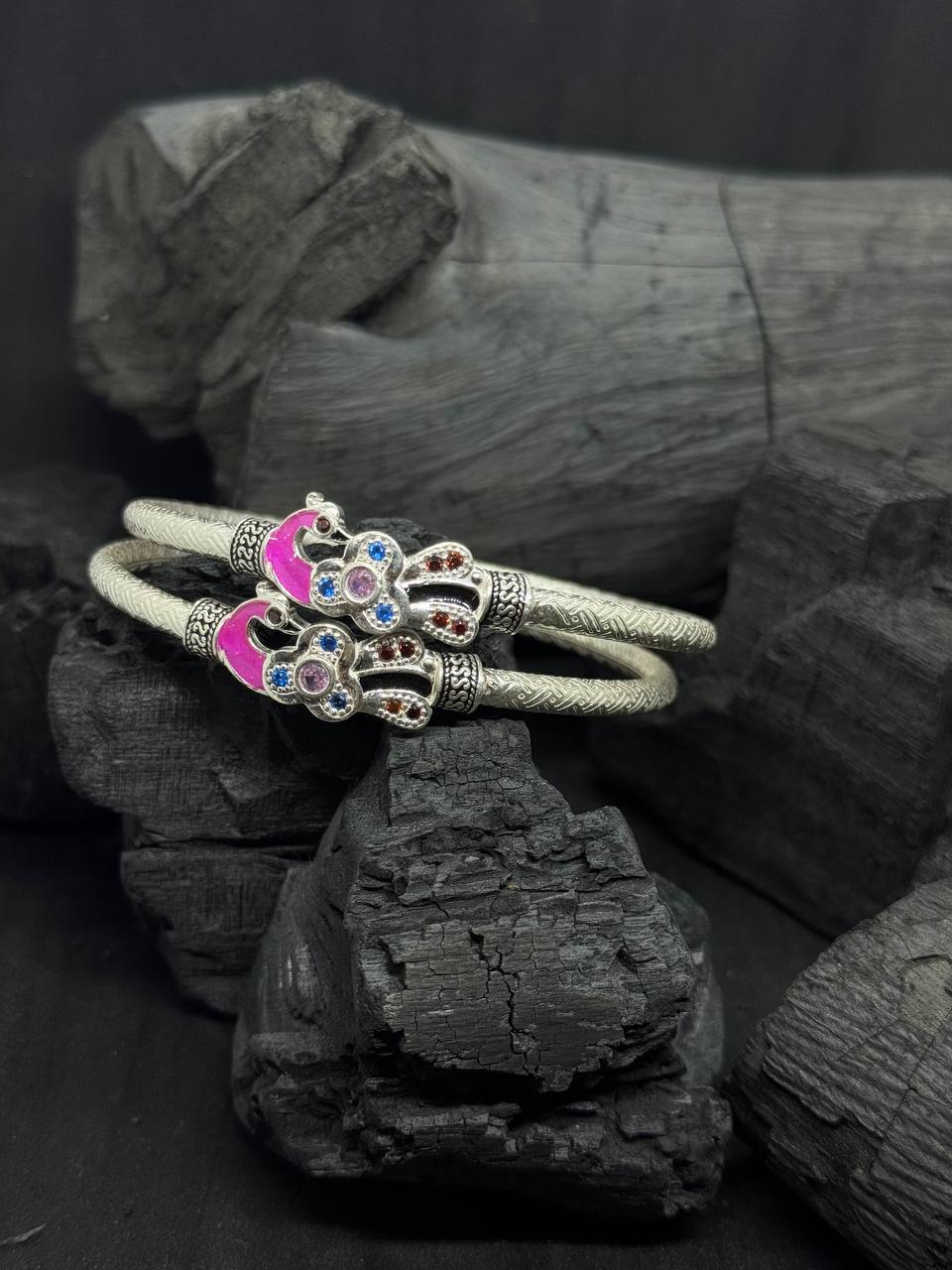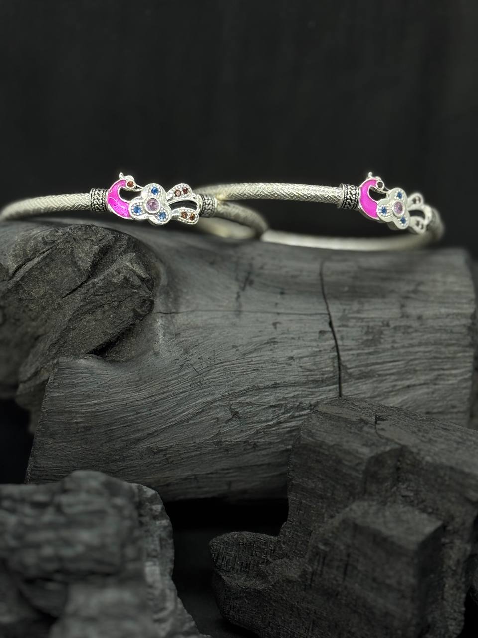 Pink Peacock Design Kada – Elegant Silver Bangles (40 Grams)