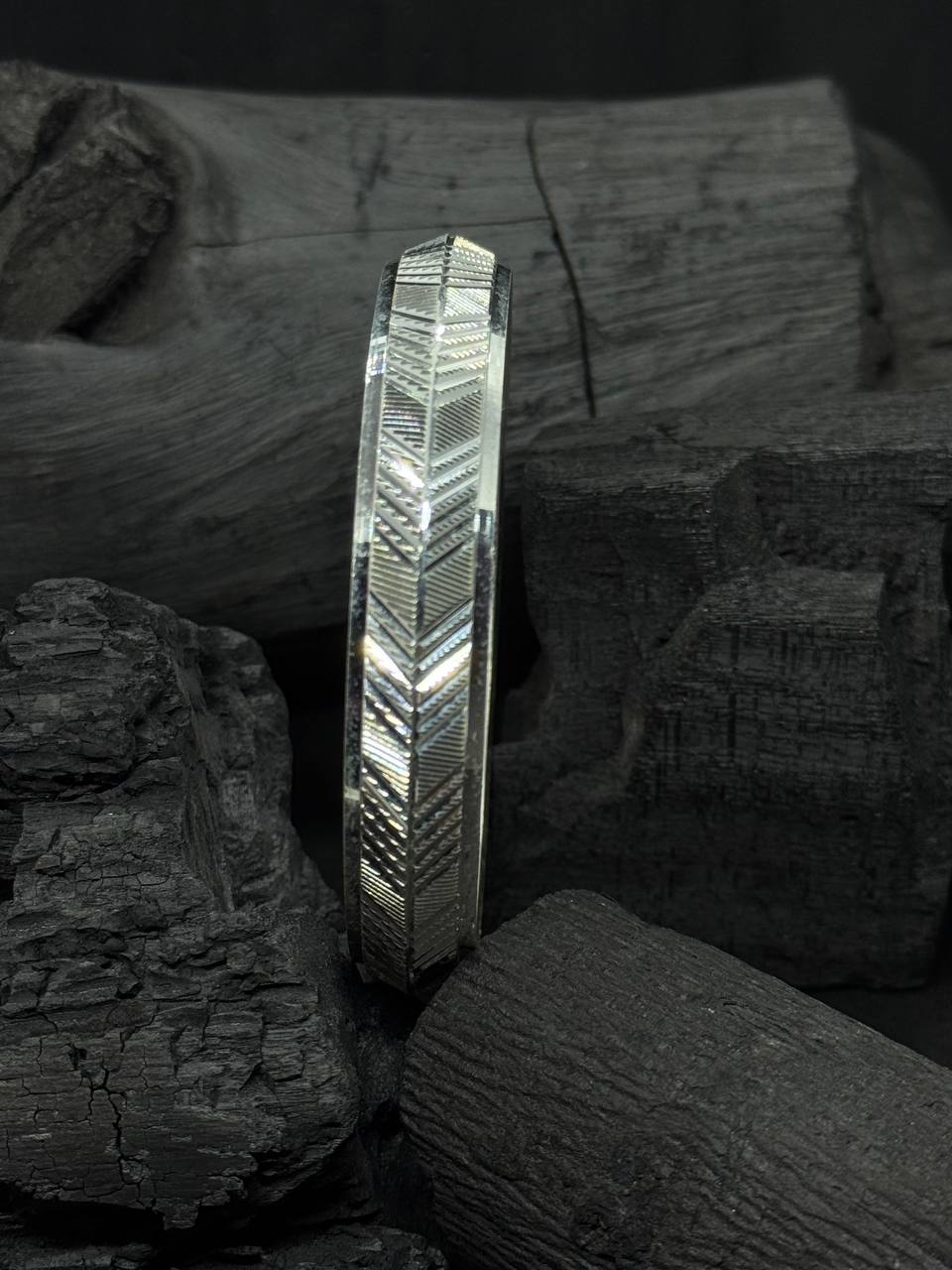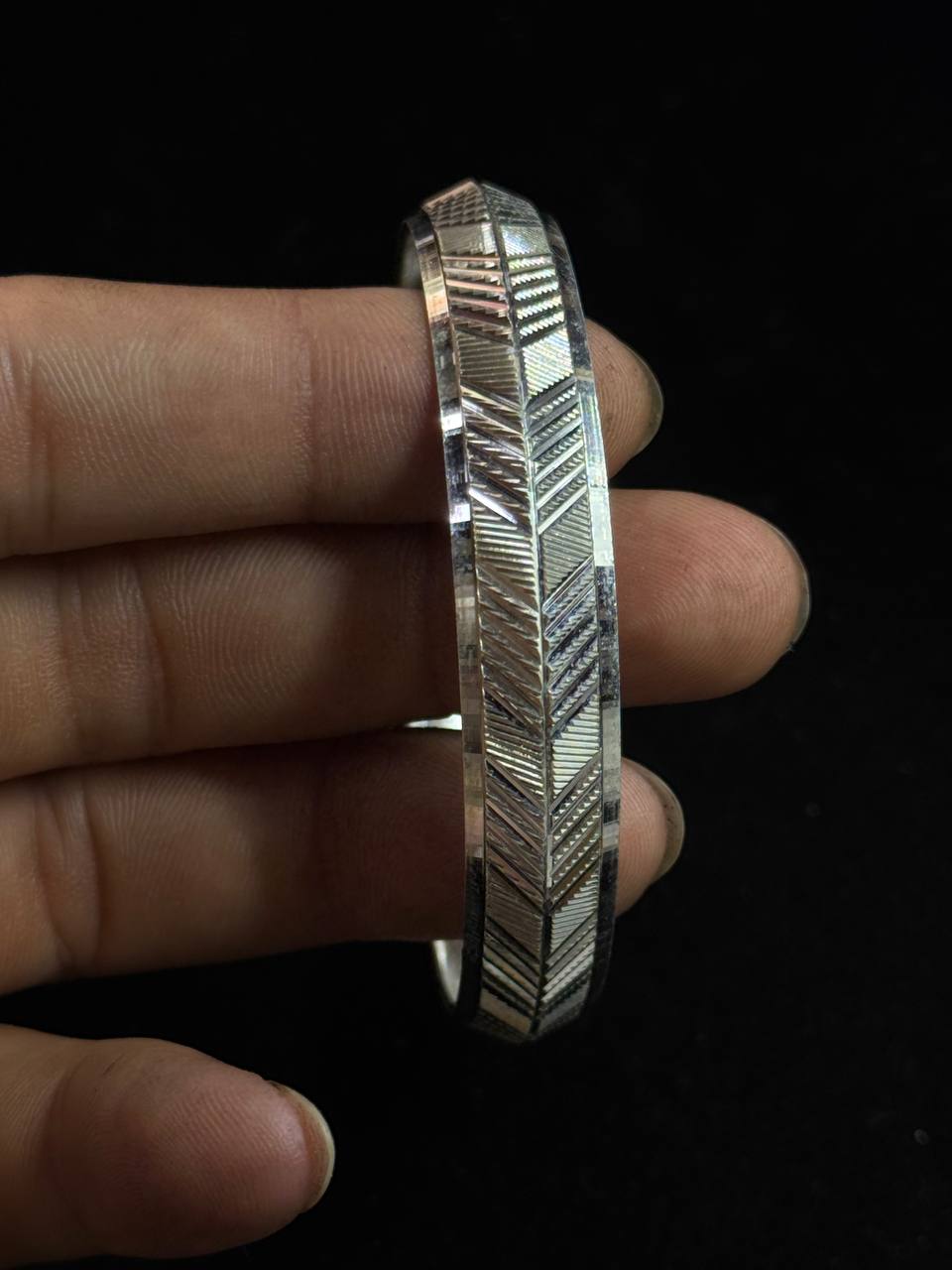 Sleek, refined, and radiating elegance — the Stylish Design Kada by AJ Silver Jewellery is a celebration of modern craftsmanship. Made from premium 925 silver, this kada features a bold geometric pattern with fine detailing that reflects light beautifully, giving it a dynamic, high-polish look. The angular textures and clean lines make it a standout piece, perfect for those who appreciate subtle sophistication with a modern twist.
